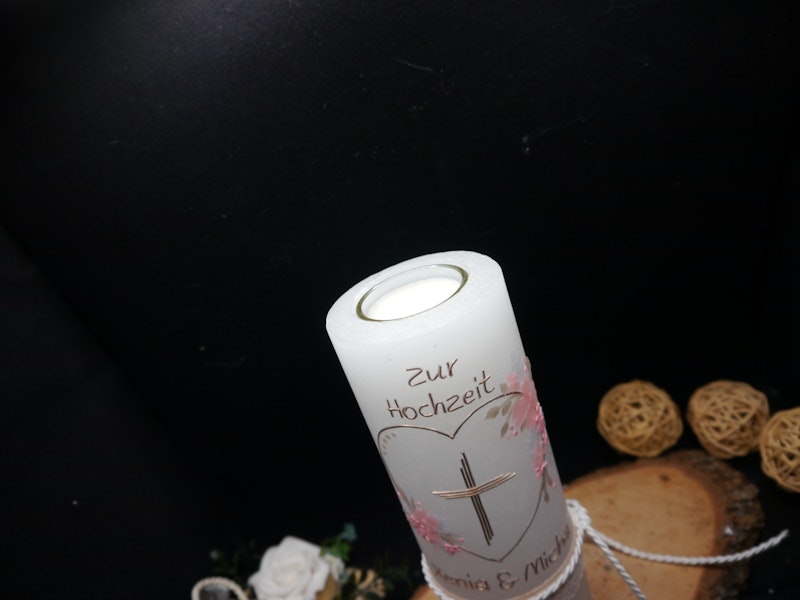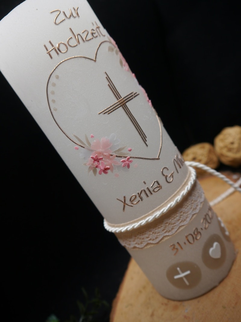 Individuelle Hochzeitskerze – Traukerze mit Herz & Kreuz im Vintage Stil, personalisiert & wachsverziert, optional mit Teelichteinsatz – Exklusive Deko für die kirchliche Trauung
