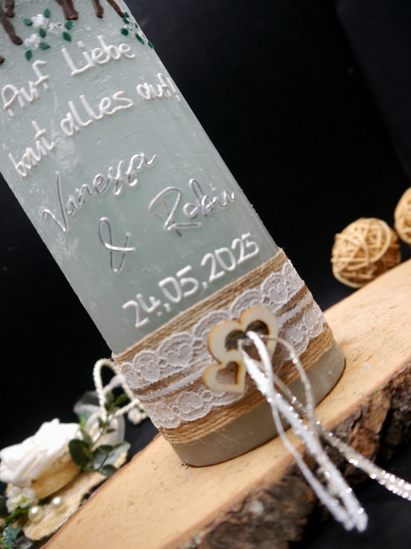 Diese außergewöhnliche Hochzeitskerze lädt zum Innehalten und Träumen ein – ein Unikat, liebevoll in eukalyptusfarbenen Nuancen gestaltet und von Hand verziert mit einem feinen Motiv von Reh und Hirsch, die anmutig vor einem stilisierten Eigenheim stehen. Ein Sinnbild für Liebe, Verbundenheit und das gemeinsame Zuhause, das viele Paare an ihrem großen Tag zelebrieren. Die rustikale Optik, kombiniert mit Vintage-Charme, macht diese Traukerze zu einem besonderen Highlight auf jeder Trauung und Feier. Ein weiteres, sinnvolles Detail: Optional kann die Kerze mit einem praktischen Teelichteinsatz bestellt werden – für langanhaltendes Licht und symbolische Wärme, wann immer ihr es wünscht. Personalisierte Daten wie Namen und Hochzeitsdatum werden vom Künstler auf Wunsch sorgsam und individuell aufgebracht, sodass eure Traukerze wirklich einzigartig wird. Ob als Geschenk zur Hochzeit, für eure eigene Trauung oder als bleibende Erinnerung an einen bedeutsamen Moment – diese kunstvoll wachsverzierte Hochzeitskerze fasst die leisen, aber kraftvollen Emotionen eines Lebensbeginns zu zweit in liebevollen Details zusammen.