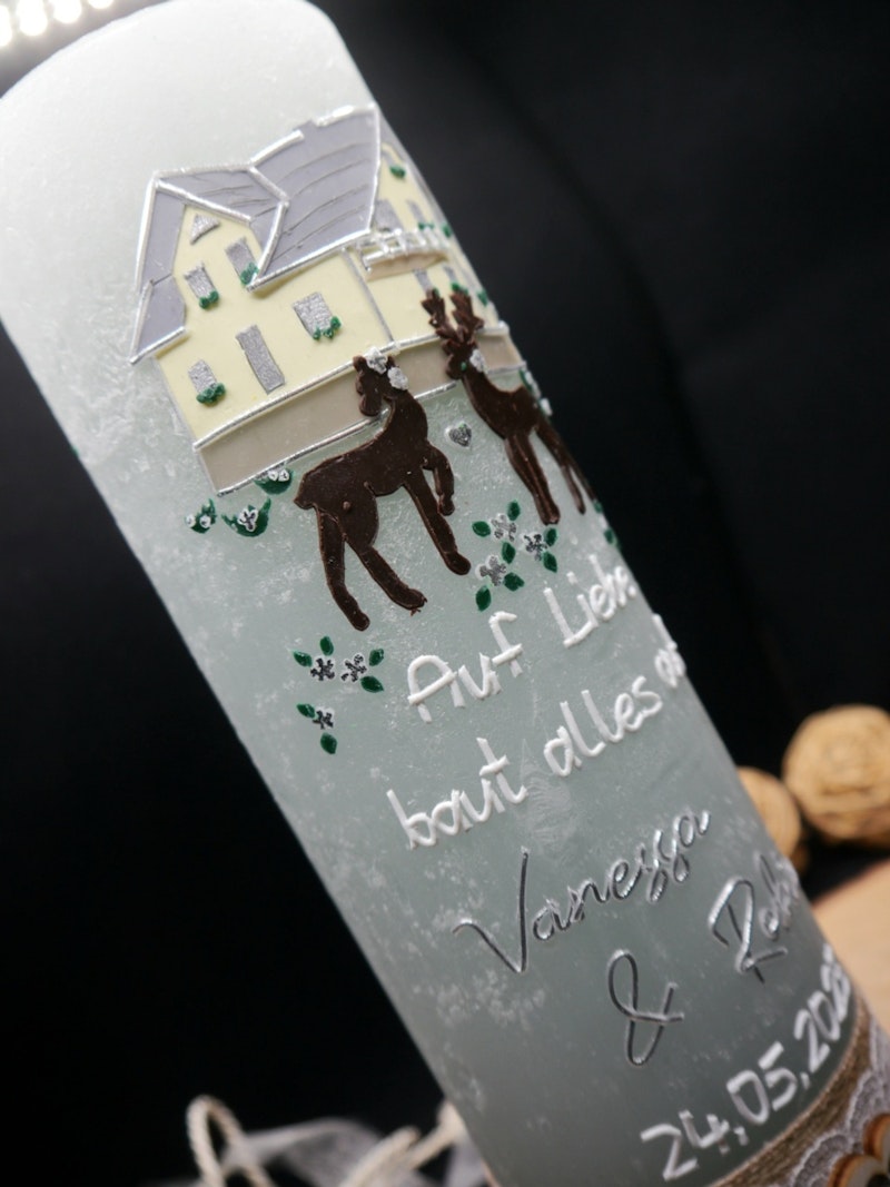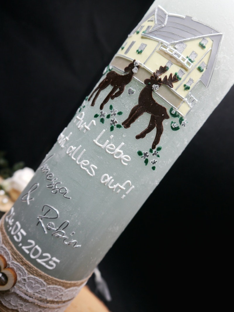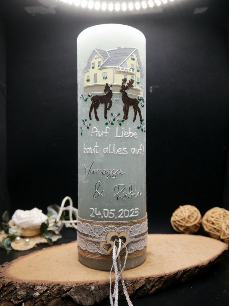 Individuelle Hochzeitskerze mit Reh & Hirsch vor eurem Eigenheim, optional mit Teelichteinsatz und Trauspruch – Vintage, Rustikal, Eukalyptusfarben, personalisierbar, 25x8cm
