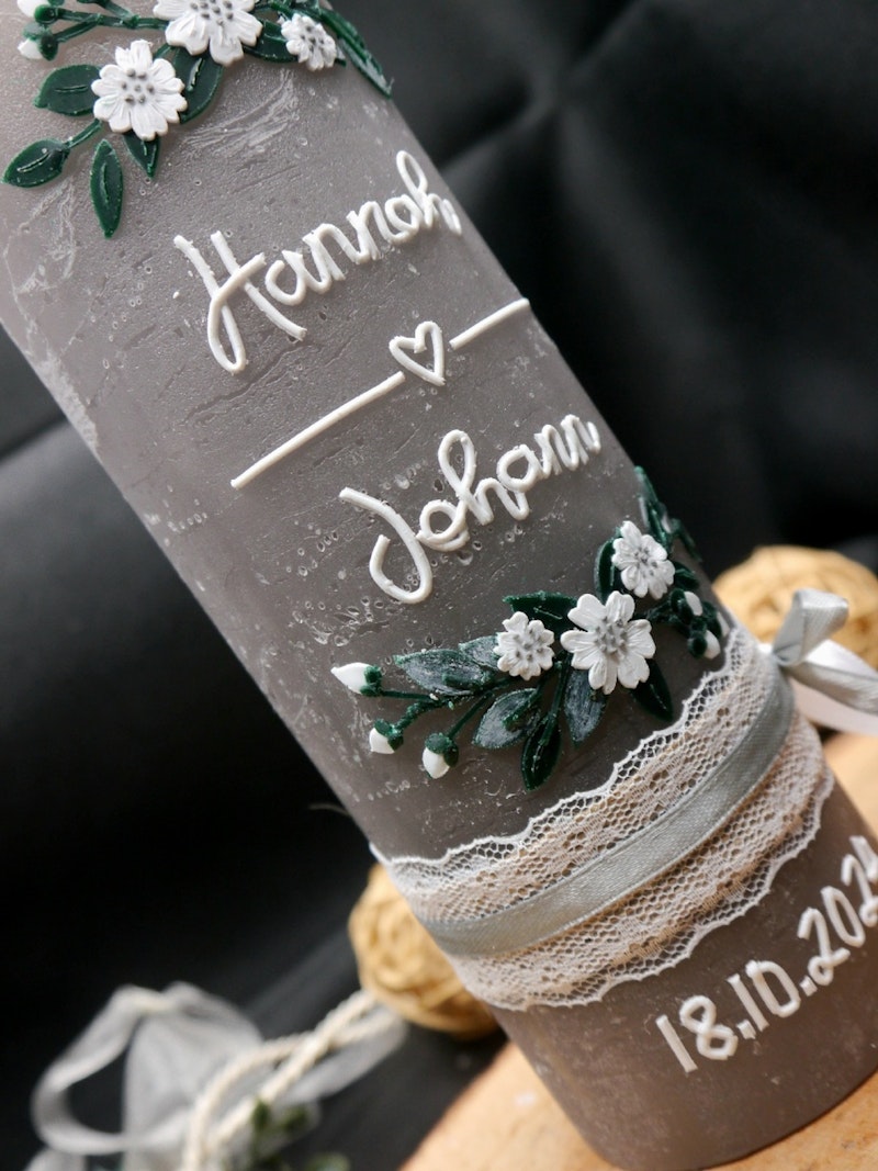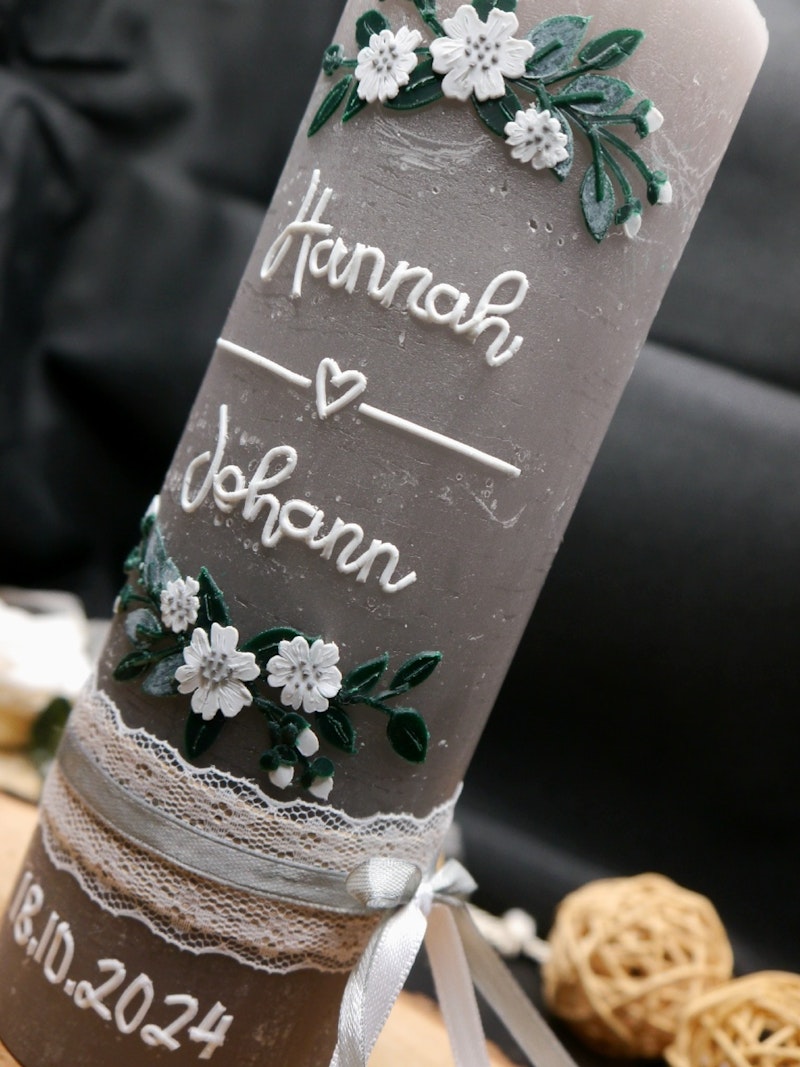 Hochzeitskerze Traukerze Rustikal Grau oder Taupe individuell personalisiert Vintage Art Blütendekor handgemacht optional Teelichteinsatz 20x7cm