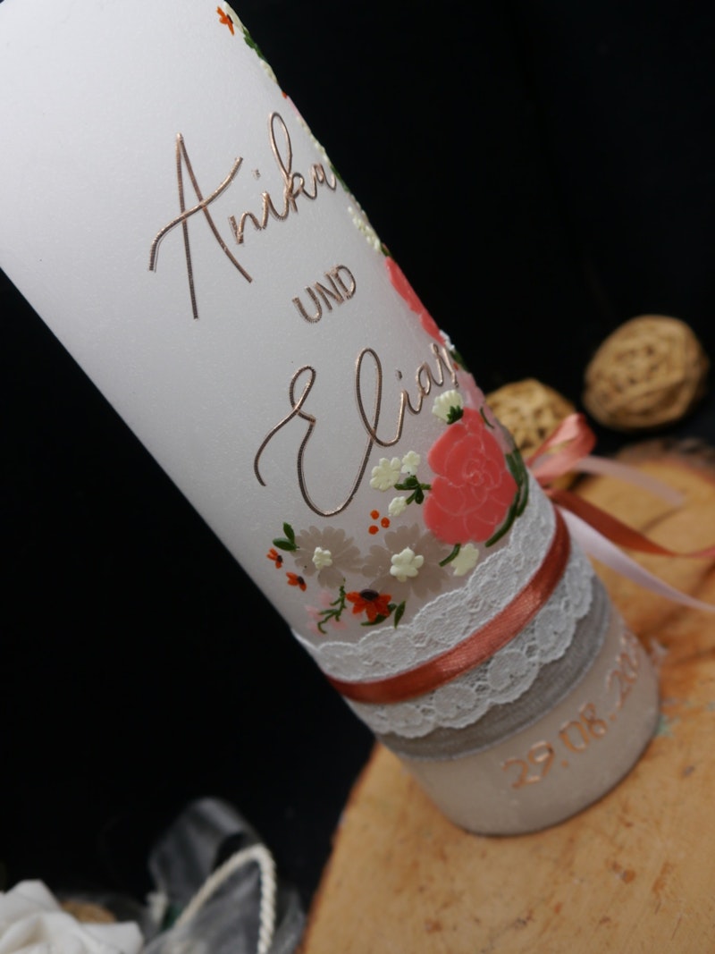 Eine Hochzeitskerze ist weit mehr als ein schlichtes Accessoire – sie begleitet zwei Menschen auf dem gemeinsamen Weg und fängt das Licht eines besonderen Moments ein. Unsere individuell personalisierte Traukerze wird sorgsam von Hand gefertigt und mit liebevoll ausgesuchten Blütenakzenten in zartem, rustikalem Weiß geschmückt. Sie lässt sich mit euren Namen und einem persönlichen Trauspruch gestalten und wird so zu einem einzigartigen Begleiter für euren großen Tag. Optional kannst du einen praktischen Teelichteinsatz wählen, sodass die Kerze als bleibendes Erinnerungsstück immer wieder aufleben kann. Die Maße von 20x7 cm machen sie zum eleganten Highlight auf jedem Altar oder Trautisch. Als Beistellkerze harmoniert sie ideal mit weiteren Hochzeitsdekorationen und bringt die Romantik eurer Feier wundervoll zum Ausdruck. Jede Kerze wird individuell für dich gefertigt und erzählt eure persönliche Liebesgeschichte auf sanfte, nachdenkliche Weise.