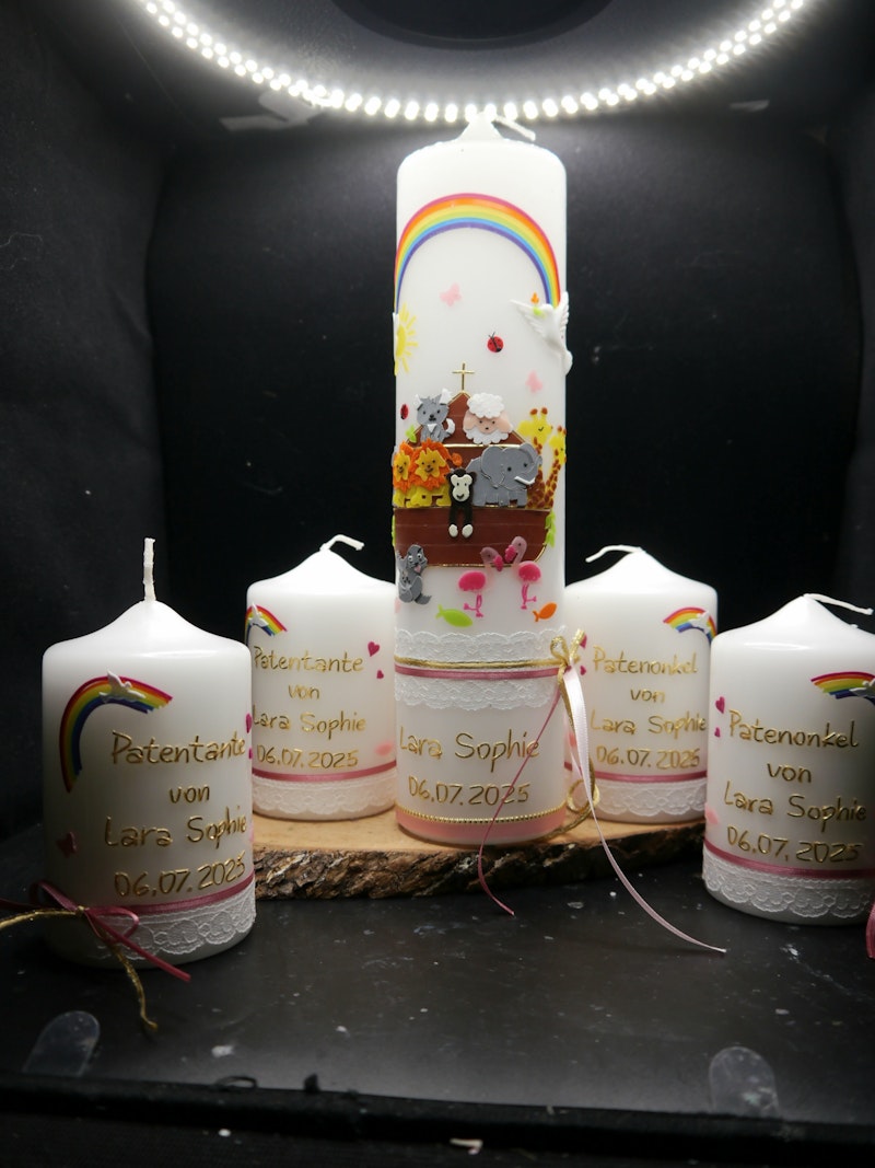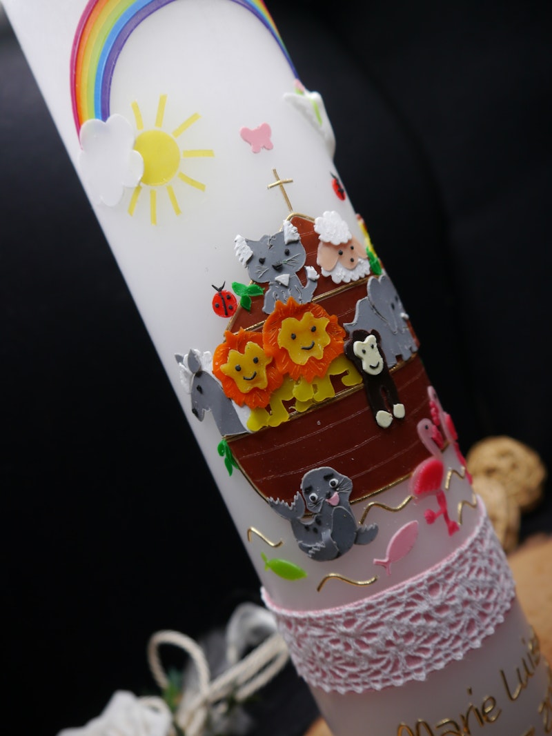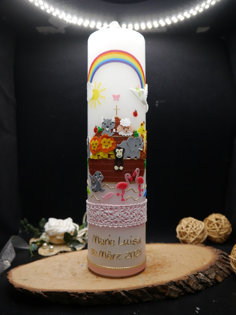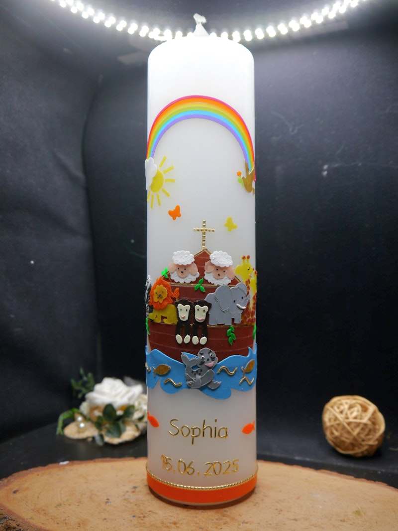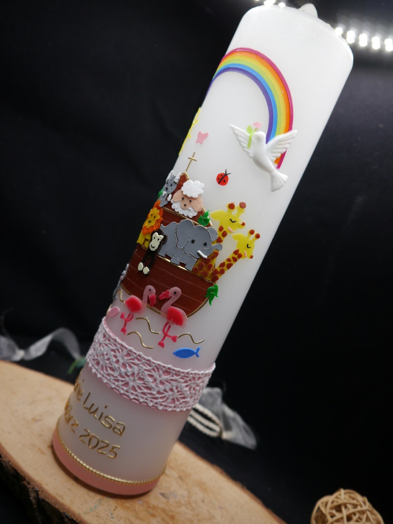 Individuell personalisierte Taufkerze Arche Noah mit Regenbogen - Handgemachte Wachskunst für Mädchen
