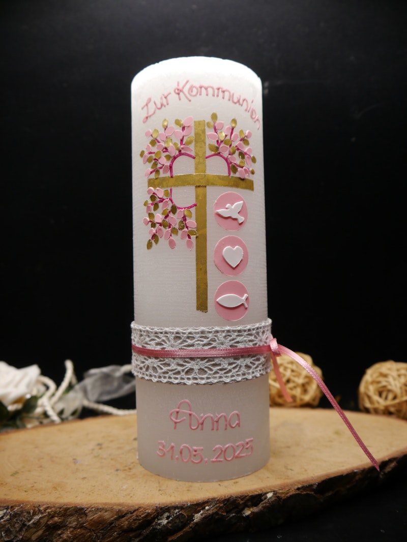 Individuelle Taufkerze und Konfirmationskerze für Mädchen - Rustikale weiße Kerze mit rosa-goldenem Lebensbaum und Kreuz, Vintage-Stil und Patenkerzen