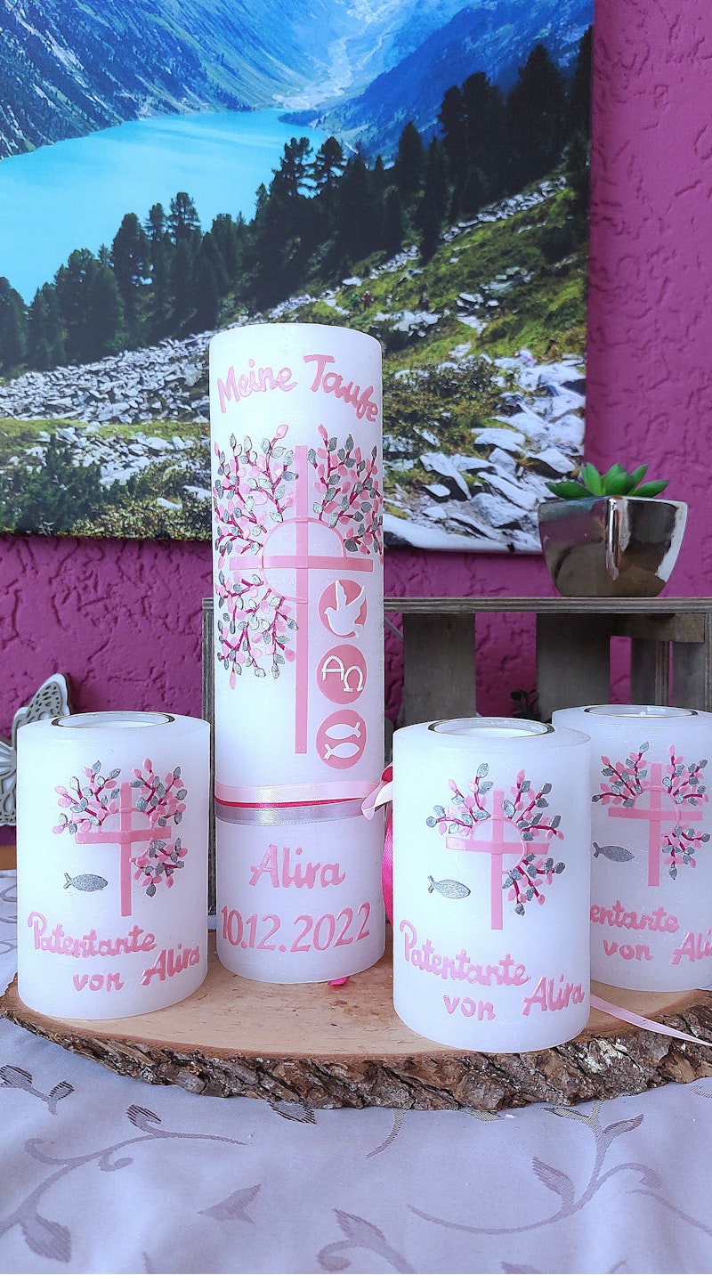 Diese individuell gestaltete Taufkerze ist das perfekte Geschenk für die Taufe oder Konfirmation eines Mädchens. Die Kerze besticht durch ihr rustikales Design in Weiß, elegant verziert mit einem Lebensbaum und Kreuz in sanften Rosa- und Goldtönen. Hergestellt aus hochwertigen Materialien, symbolisiert die Kerze den Glauben und das Wachstum im christlichen Leben. Jede Kerze kann personalisiert werden, um den besonderen Anlass hervorzuheben und eine bleibende Erinnerung zu schaffen. Auch mit Patenkerze erhältlich, verbindet sie traditionelle Glaubenssymbole mit einem Hauch von Vintage-Romantik.