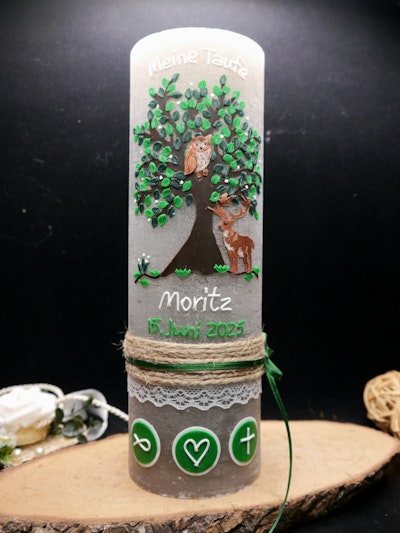 Taufkerze Lebensbaum Hirsch Eule oder Fuchs Rustikal Grau oder Taupe Optional Taufspruch und Teelichteinsatz