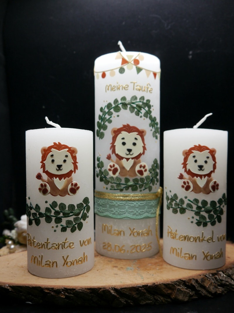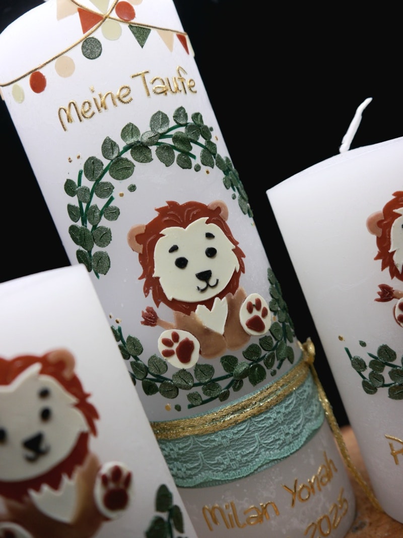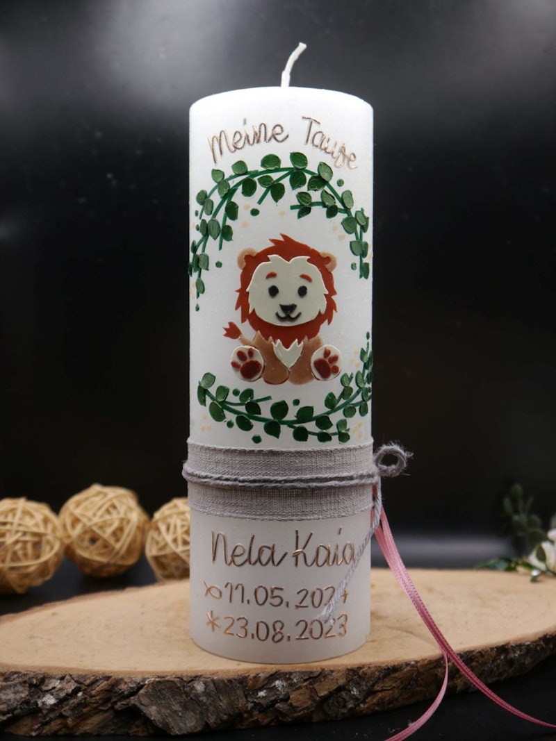 Handgemachte rustikale Taufkerze – Baby Löwe & Eukalyptus Kranz – Personalisierbar für Mädchen & Jungen